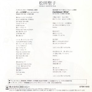 Boy no Kisetsu (ボーイの季節) is a single album by Seiko Matsuda (松田聖子) released on May 9, 1985. The song was a hit, but it was difficult to hear the song on TV because she was taking a break from activities after getting married in June 1985.
