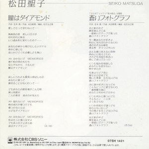 Hitomiwa Diamond (瞳はダイアモンド) on the A-side is a lyrical and emotional ballad, and is the first full-fledged heartbreak song in Seiko Matsuda’s songs.