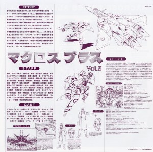 MACROSS PLUS (マクロスプラス) is an official sequel that continues the story after the events of Super Dimension Fortress Macross. The general director is Shoji Kawamori, and at the time, a new director, Shinichiro Watanabe, took charge of the actual megaphone, and the work was assembled by an extremely luxurious staff including Keiko Nobumoto for the script, Yoko Kanno and Hajime Mizoguchi for the music, and Ichiro Itano, Masami Goto, and Yasushi Muraki for the mecha animation. The original animators were also first-class animators from Gainax and Bones. Kawamori planned the scenario and worldview, while Shinichiro Watanabe and Keiko Nobumoto created the details. As for directing, Kawamori mainly worked on the camera work and composition, and Shinichiro Watanabe did the details. It consists of 4 LD disks.