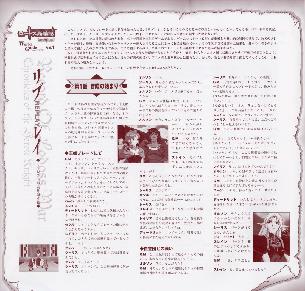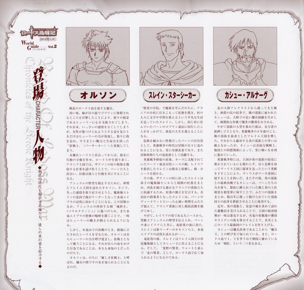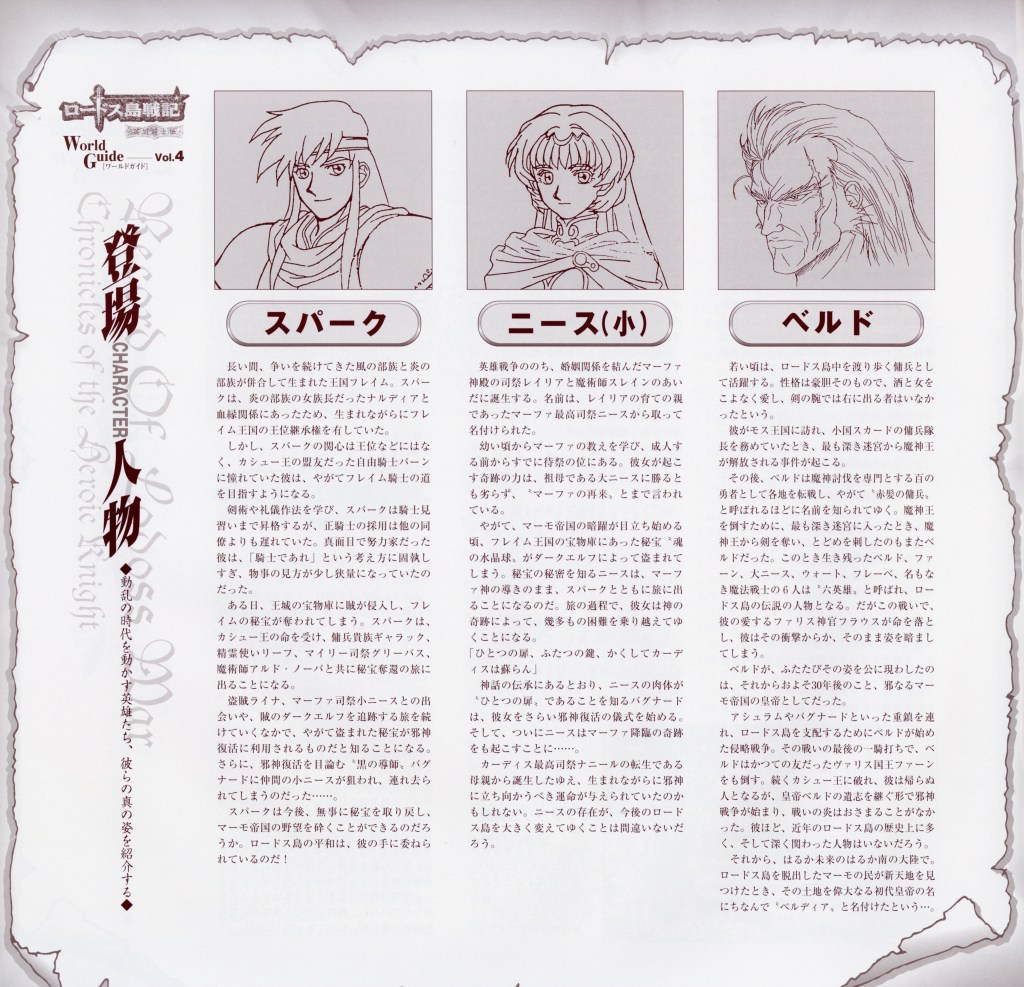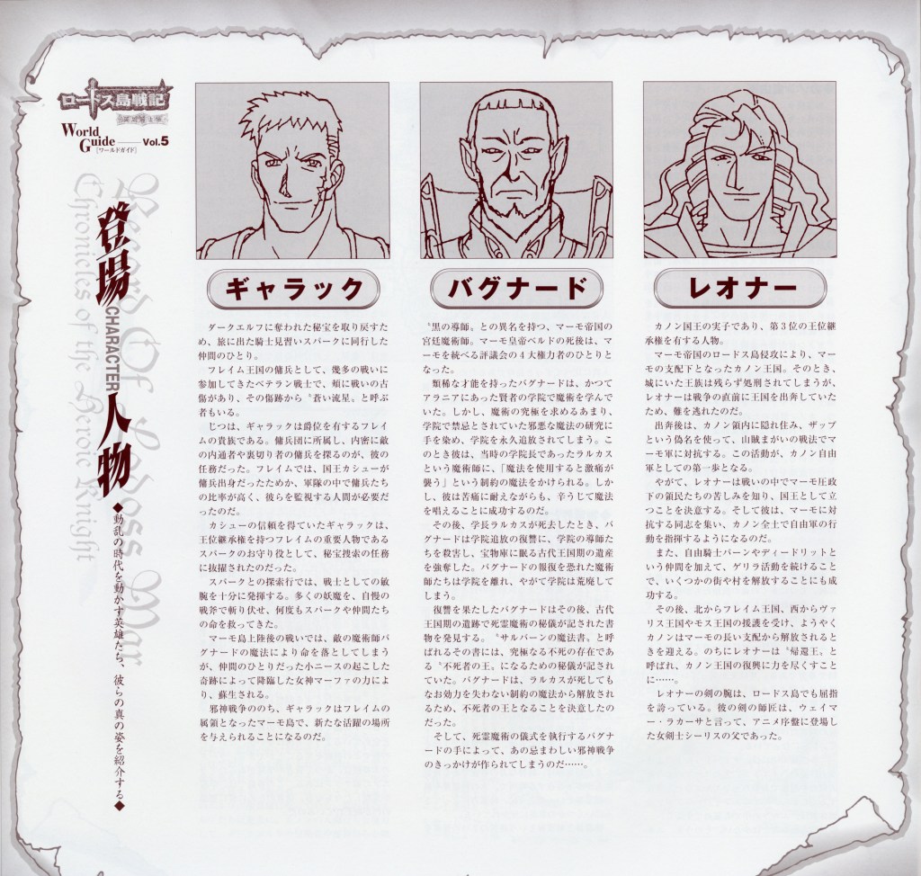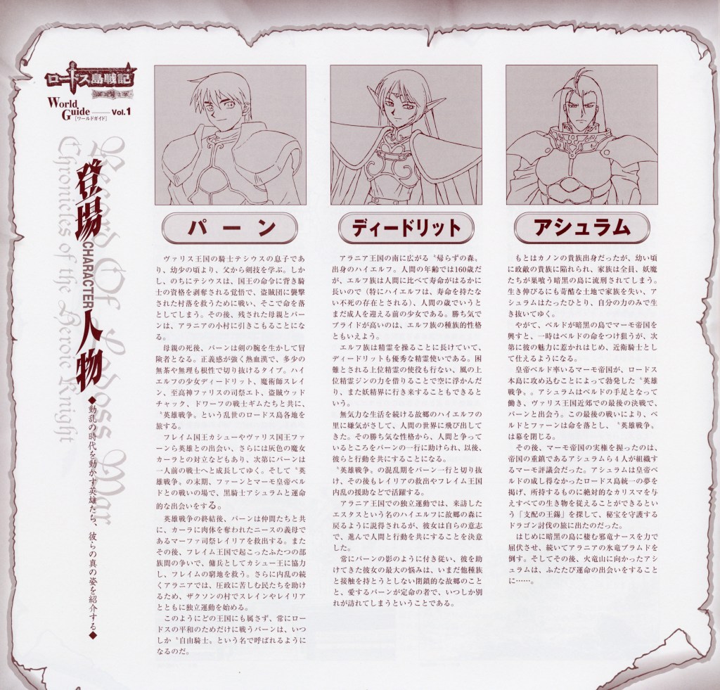 At the center is Spark, a young and determined knight who aspires to live up to the legacy of the legendary hero Parn. Alongside a diverse group of companions—including warriors, mages, and elves—Spark embarks on a perilous journey to protect the realm from dark forces seeking to plunge Lodoss back into chaos.