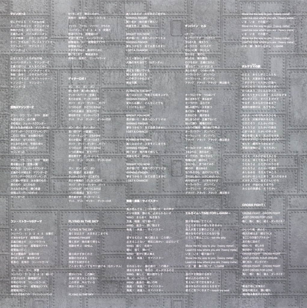 This is a concert video of live performances of the Super Robot Animation theme songs held in 1997. A total of 22 songs are included.