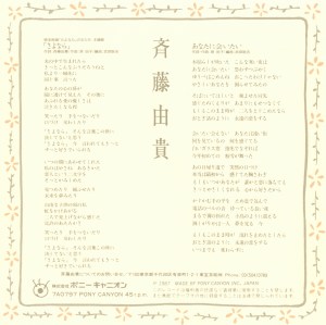 “Sayonara” (“さよなら”) is the 10th single album by Yuki Saito (斉藤由貴), released on November 18, 1987. It is the first single album to feature a song written by Yuki Saito herself on the A-side. Sayonara was used as the theme song for the Toho film Sayonara no onnatachi (“さよなら”の女たち).