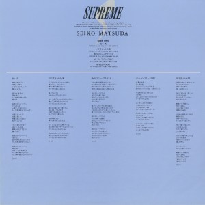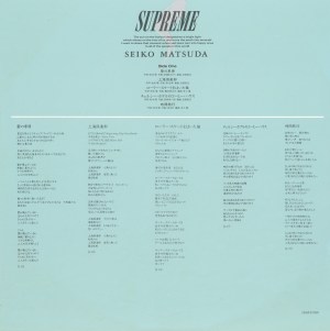 SUPREME is Seiko Matsuda’s 13th studio album, released on June 1, 1986. It was released while she was taking a break from activities due to pregnancy and childbirth. Along with Utopia (ユートピア) and Canary (1983), it is considered one of the three best albums by fans. It won the Album Grand Prize at the 28th Japan Record Awards.